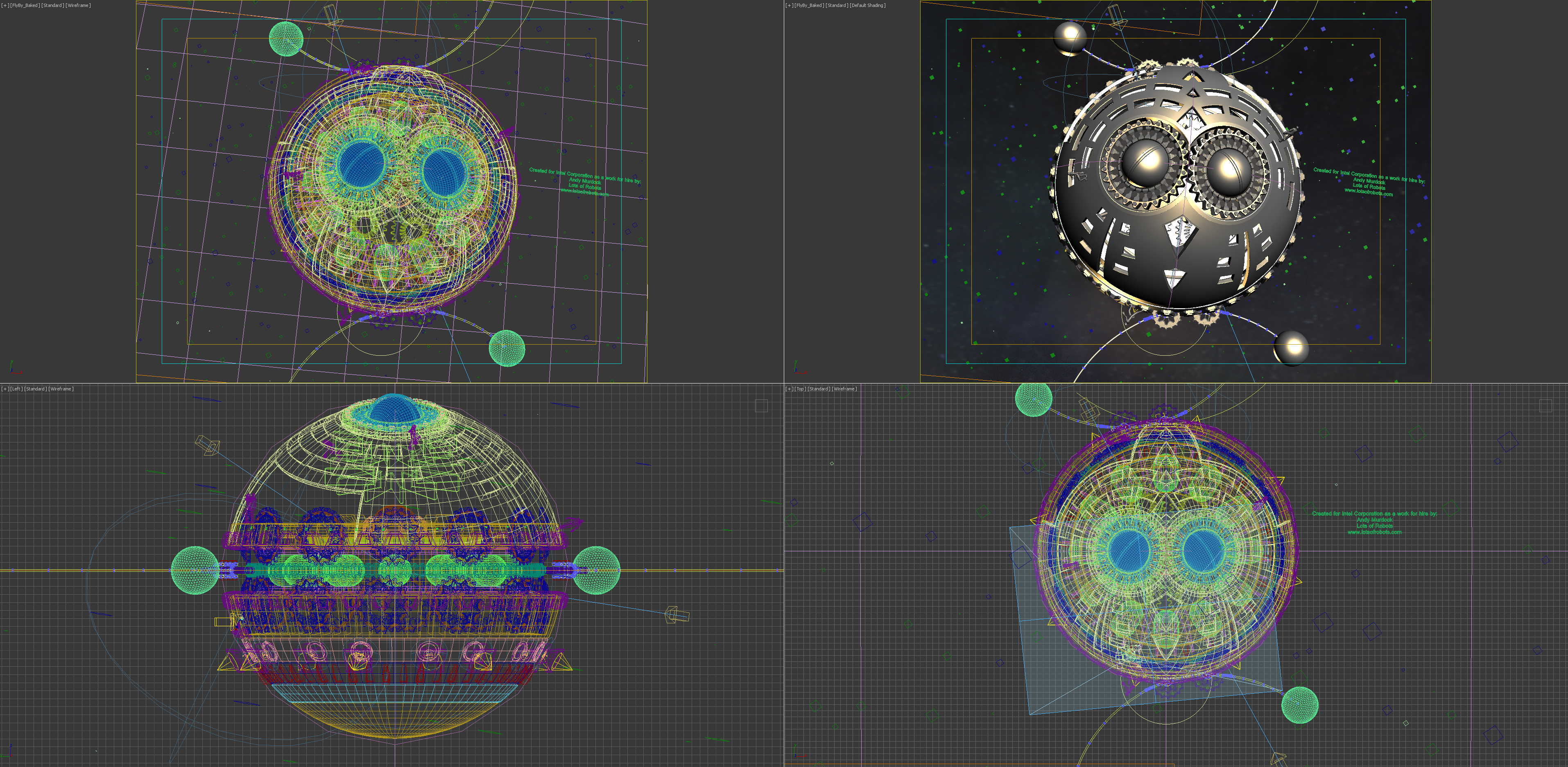 Wireframe metroverse scene on quad viewports