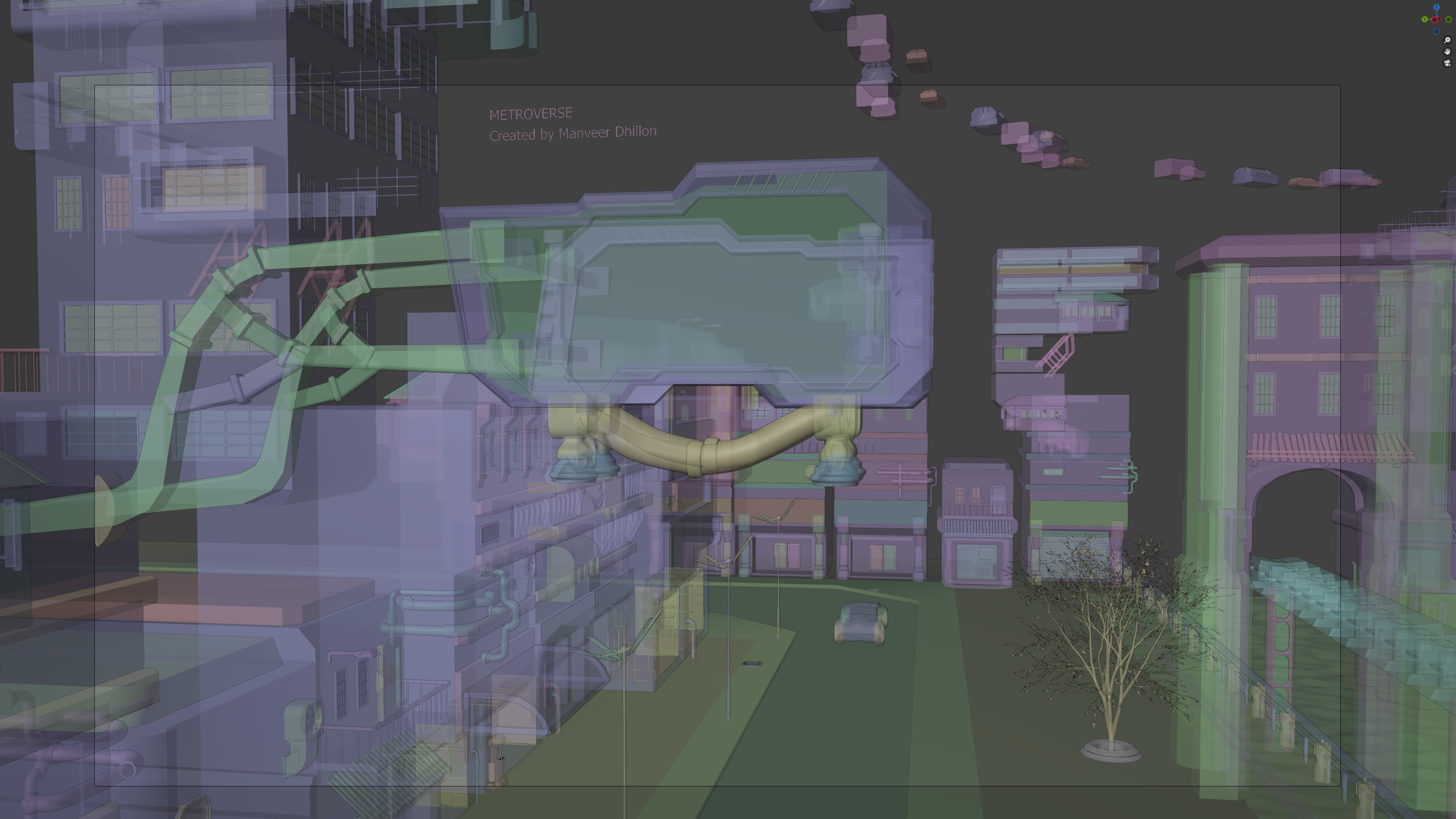 X-ray shaded metroverse scene with random color per object