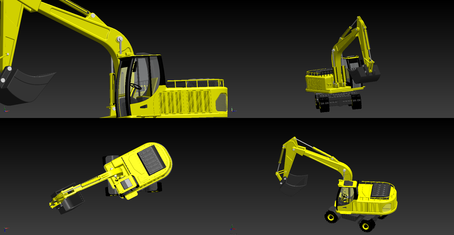 Shaded excavator on four viewports
